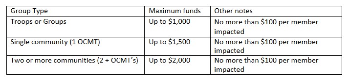 What can I request funds for? Funds can be used to support volunteer development, girl programming and recruitment activities.